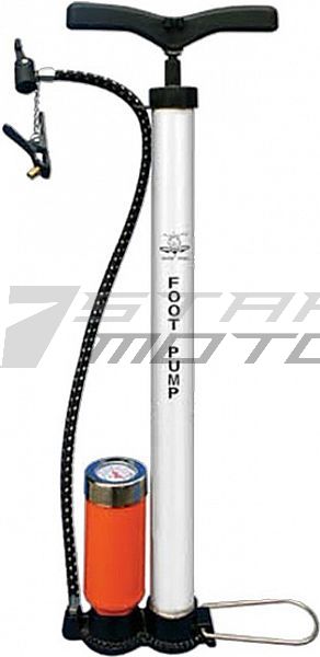 Alumiiniumist. Näidiku ja topeltsilindriga. Pumbaga saab pumbata kõiki enamlevinud ventiile. 45 cm. jalatoega.